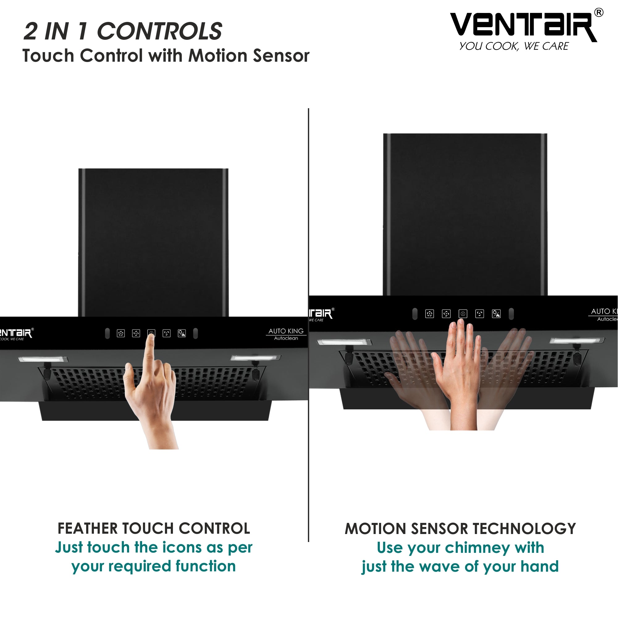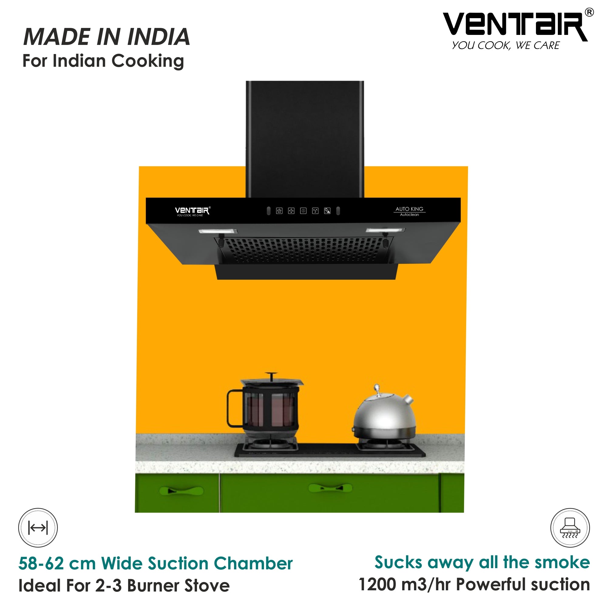 Ventair brings to you Advanced 3rd Generation Heat Autoclean Chimney, Auto King. Proudly Made in India, with extreme precision and a T-shape design that will elevate your kitchen environment for years to come, Auto King truly one of the best chimneys in India. It looks elegant, works efficiently clearing all the smoke in your kitchen with its powerful 1200 m3/hr suction.